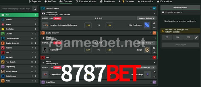 O 8787bet oferece uma grande seleção de opções de apostas em e-sports com probabilidades competitivas